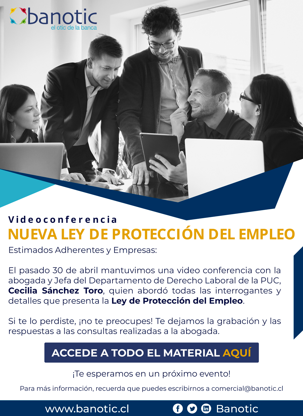 El Otic de la Banca realizó una video conferencia – vía streaming – con la abogada Cecilia Sánchez Toro, Ex Directora Nacional del Trabajo, Decana de la Pontificia Universidad Católica de Chile, relatora permanente de ICARE, sobre la recién aprobada “Ley de Protección del Empleo”.