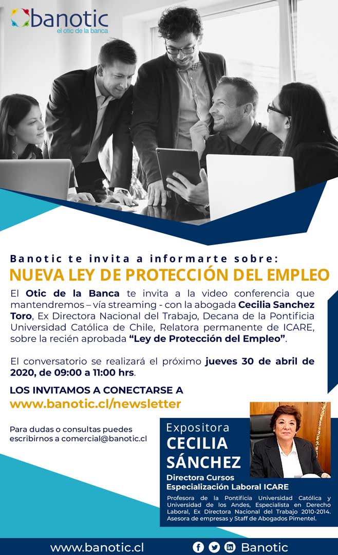 El Otic de la Banca realizó el pasado 30 de abril una video conferencia – vía streaming – con la abogada Cecilia Sánchez Toro, Ex Directora Nacional del Trabajo, Decana de la Pontificia Universidad Católica de Chile, relatora permanente de ICARE, sobre la recién aprobada “Ley de Protección del Empleo”