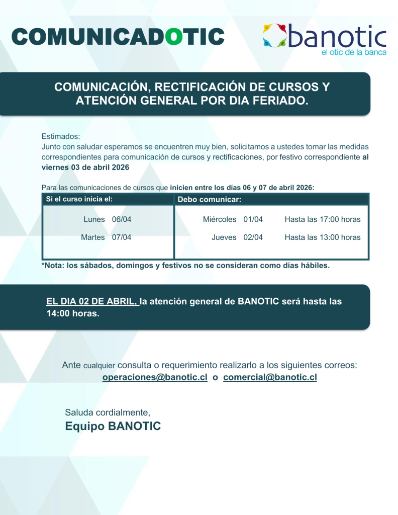 COMUNICADO BANOTIC // Comunicación de cursos y rectificaciones por día festivo